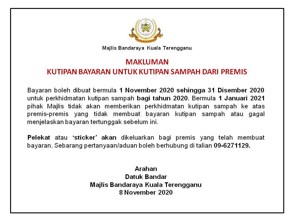 Penafian: Majlis Bandaraya Kuala Terengganu tidak bertanggungjawab terhadap sebarang kehilangan atau kerosakan yang dialami kerana menggunakan maklumat dalam laman ini.